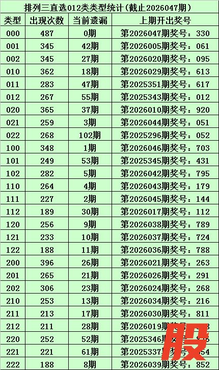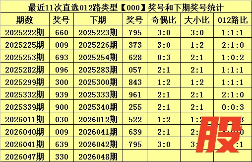 上期回顾:体彩排列三第2026047期开出奖号:330,其012路比为3:0:0,奖号012路类型为:000。