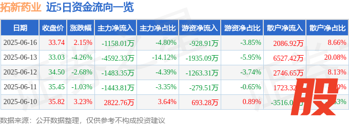 本站消息,截至2025年6月16日收盘,拓新药业(301089)报收于33.74元火配资,上涨2.15%,换手率7.86%,成交量7.16万手,成交额2.41亿元。